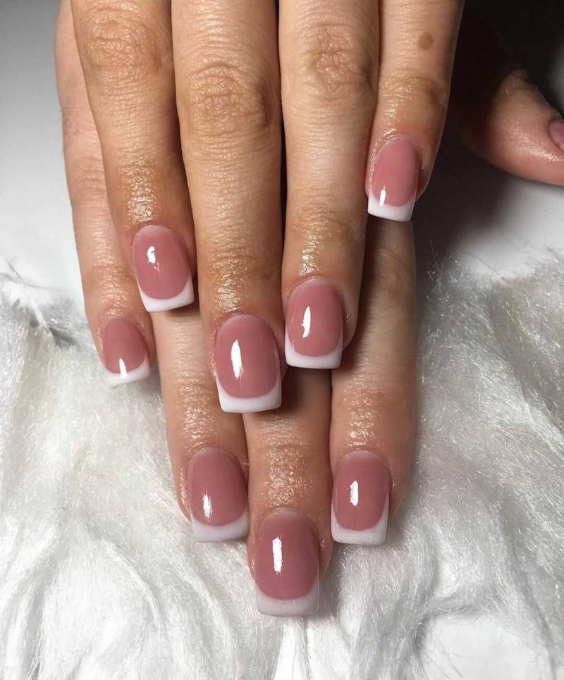 Классика – здесь все предельно просто и понятно. Главное – получить гладкую поверхность нежного пастельного оттенка. На ней прорисовывают белоснежную «улыбку» по краю ногтя. Сверху все обязательно покрывают защитным слоем, который не только предохраняет от появления изъянов, но и добавляет блеска.