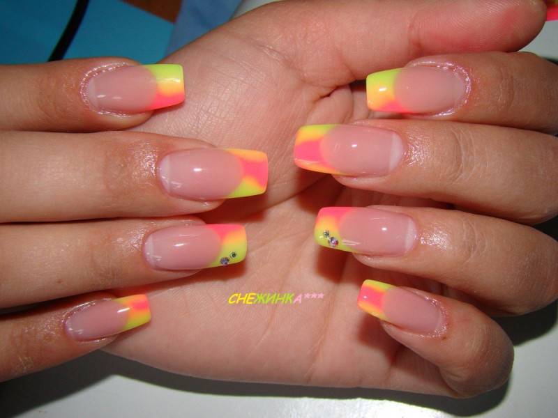 Для решительных и экстравагантных особ мода предлагает использовать для френча лаки ярких неоновых оттенков. А тем, кто не готов к экспериментам, можно выбрать лиловое, алое, бирюзовое покрытие или же традиционный белый френч в обрамлении розовых страз.