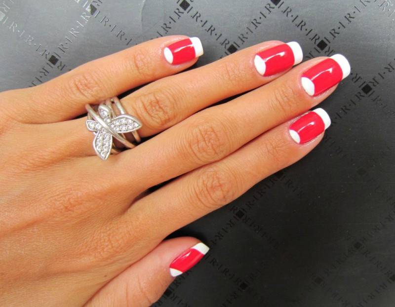 Варианты красно-белого френча с узором на короткие и длинные ногти
