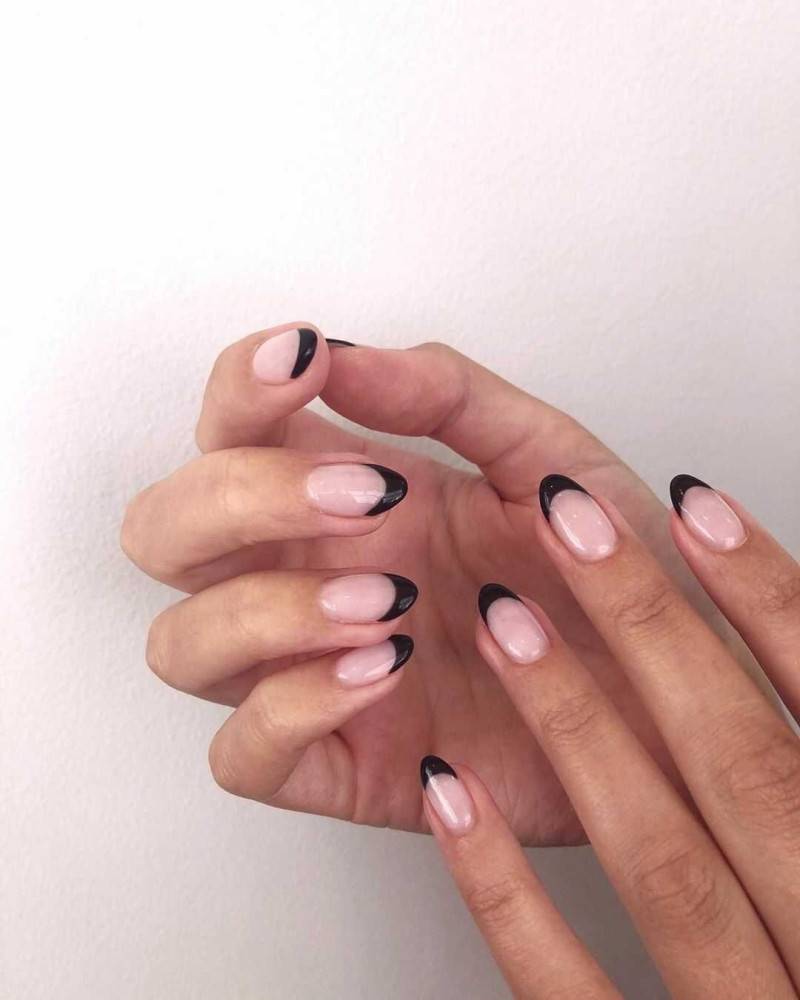 Измените традиционный французский маникюр, используя противоположный цвет на кончиках – черный. Увеличьте естественную кривую ногтя, чтобы получить эффект округления, который вы можете видеть на фото. Вы можете выбрать базовый пастельный цвет или просто прозрачный лак для ногтей.