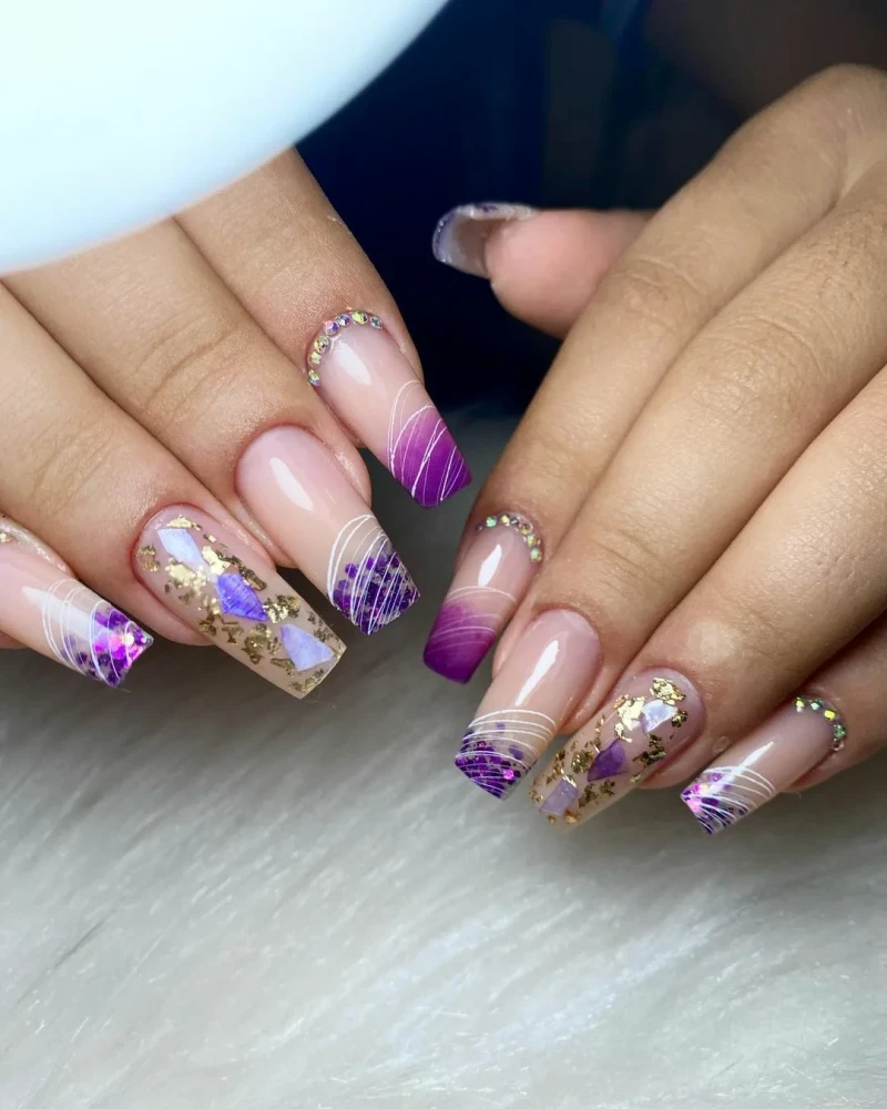 Актуален маникюр, когда блестки расположены плотным слоем по линии френча, а ноготок безымянного пальца покрывается полностью. В тренде оттенки шиммера – золотой, жемчужный, фиолетовый, медный, разноцветный.