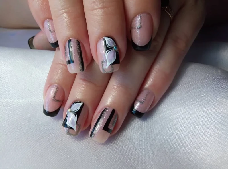 Неординарно будет смотреться черный френч с блестками по контуру улыбки. Такой маникюр может быть исполнен с яркой или нейтральной базой. Прорисовывается улыбка косой конфигурации или внахлест.