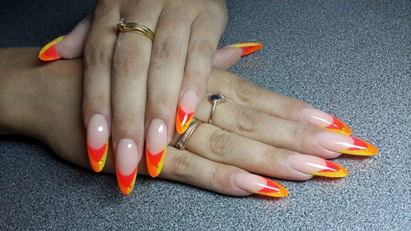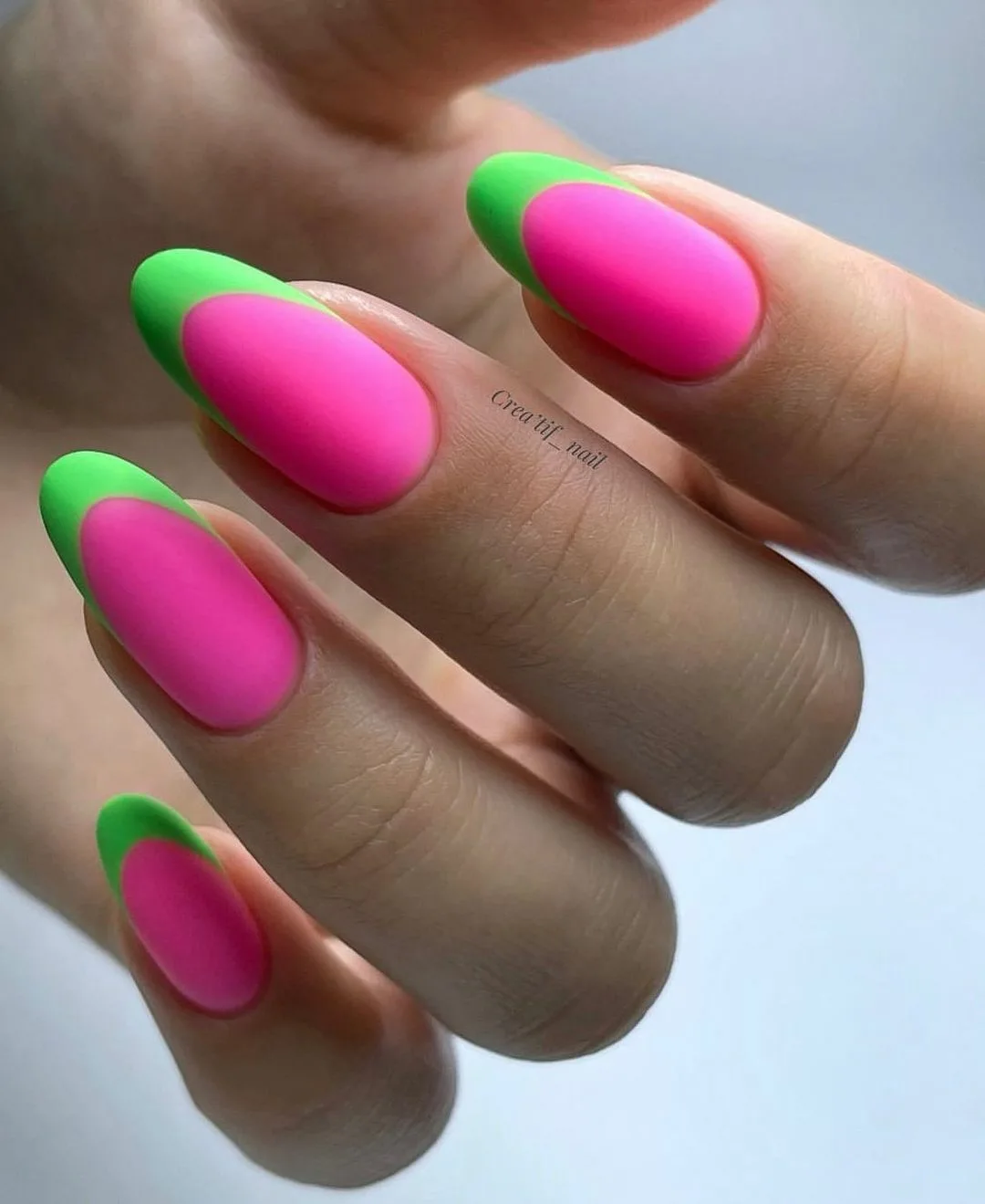 Сочетание техник французского и лунного маникюра также является трендом в 2019 году. Дизайн острых ногтей, выполненный в таком стиле, придает маникюру изысканный и эффектный вид. Главной особенностью этой техники является наличие двух улыбок, одна рисуется на кончике ногтя, а другая у его основания. Сочетание обычного с обратным френчем выполняется в пастельных тонах, для смелых особ стилисты предлагают выбрать дерзкие оттенки: фиалковый, черный, ядовито-салатовый, жгуче-оранжевый, пепельный.