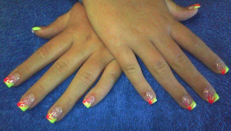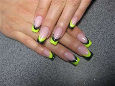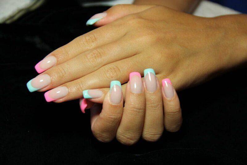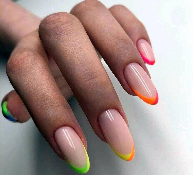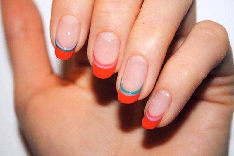 Это очень популярный на сегодняшний день вид французского маникюра. Форма французского маникюра остается стандартной, а вот исполнение слегка меняется. Вместо классических белых и пастельных оттенков используются яркие контрастные тона гель-лаков.