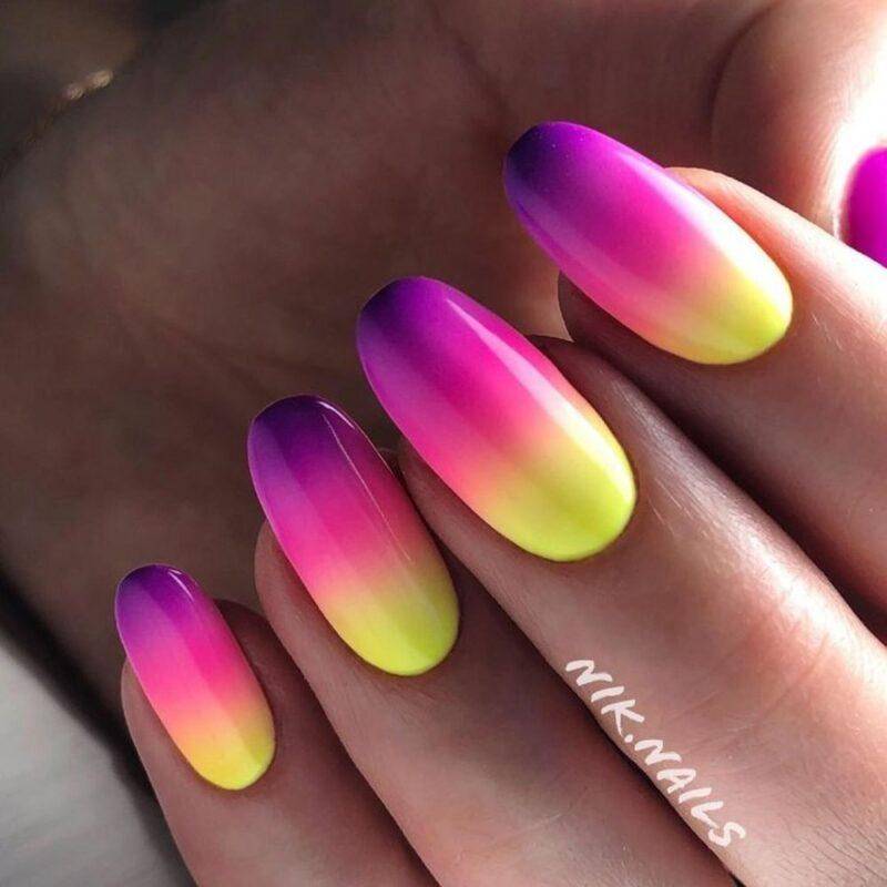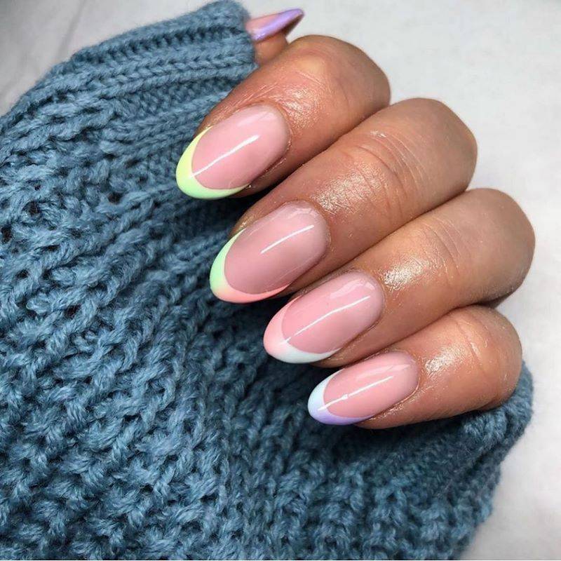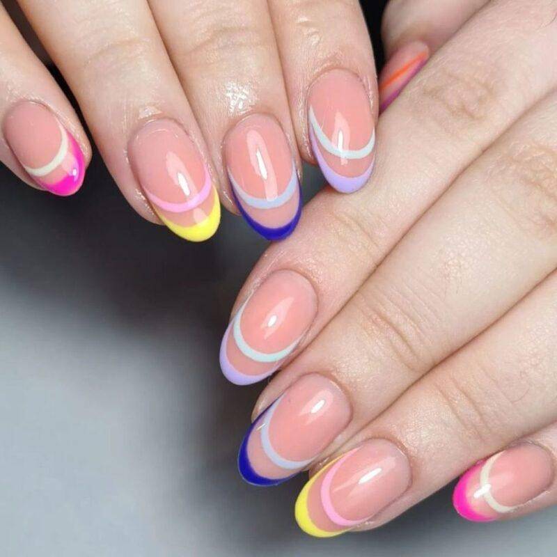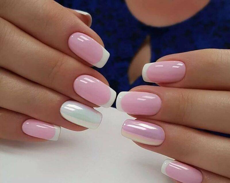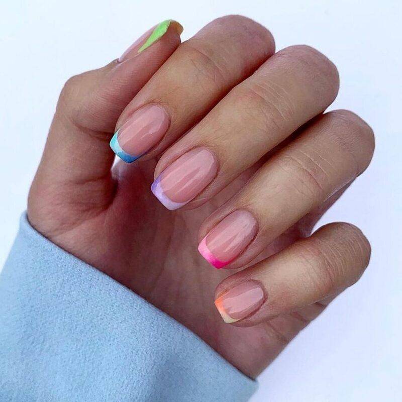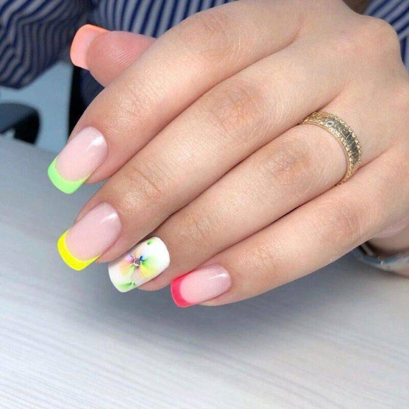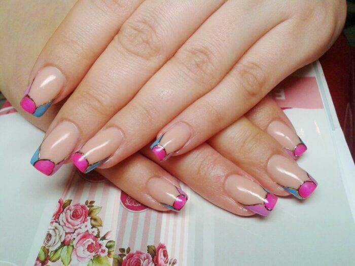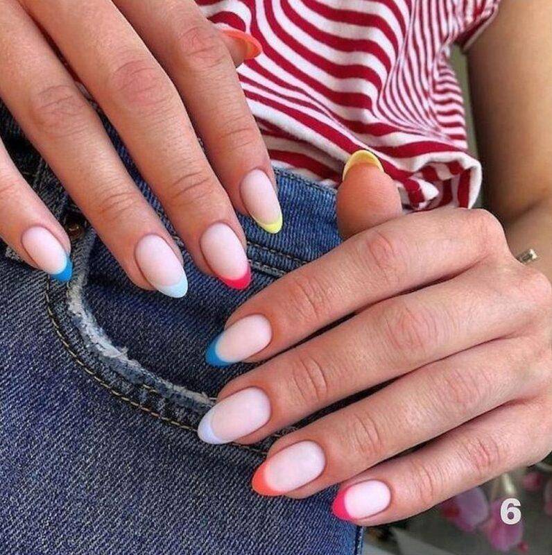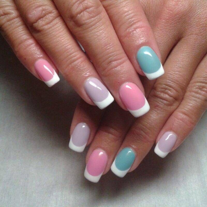 - В летний период или когда этому способствует случай, во французском маникюре можно объединить самые разные оттенки.