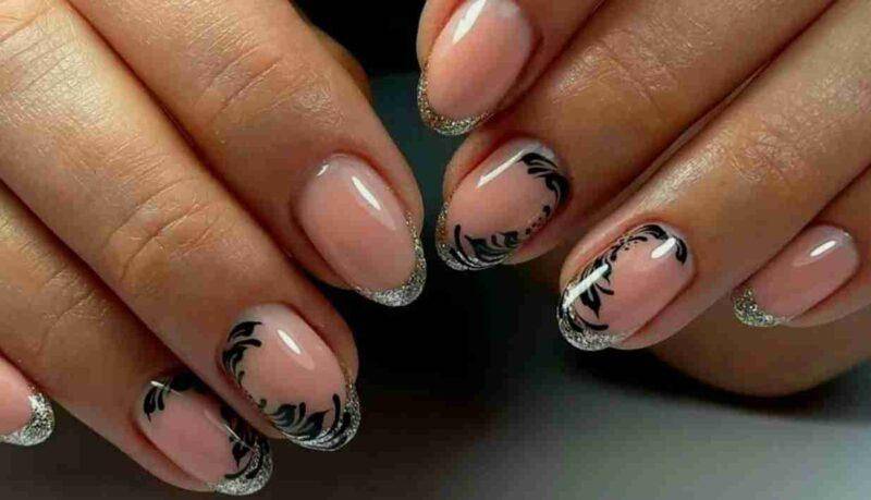Неординарно будет смотреться черный френч с блестками по контуру улыбки. Такой маникюр может быть исполнен с яркой или нейтральной базой. Прорисовывается улыбка косой конфигурации или внахлест.