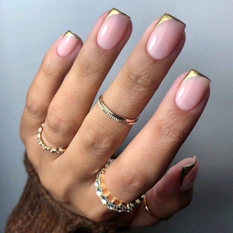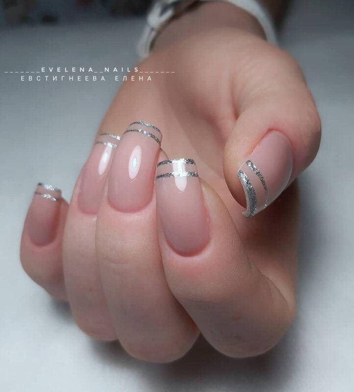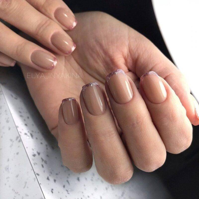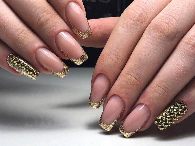 Актуален маникюр, когда блестки расположены плотным слоем по линии френча, а ноготок безымянного пальца покрывается полностью. В тренде оттенки шиммера – золотой, жемчужный, фиолетовый, медный, разноцветный.