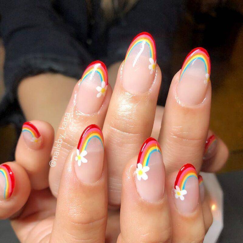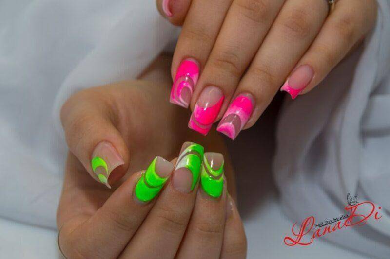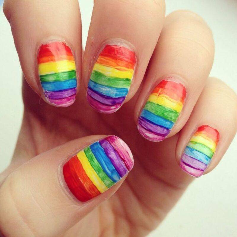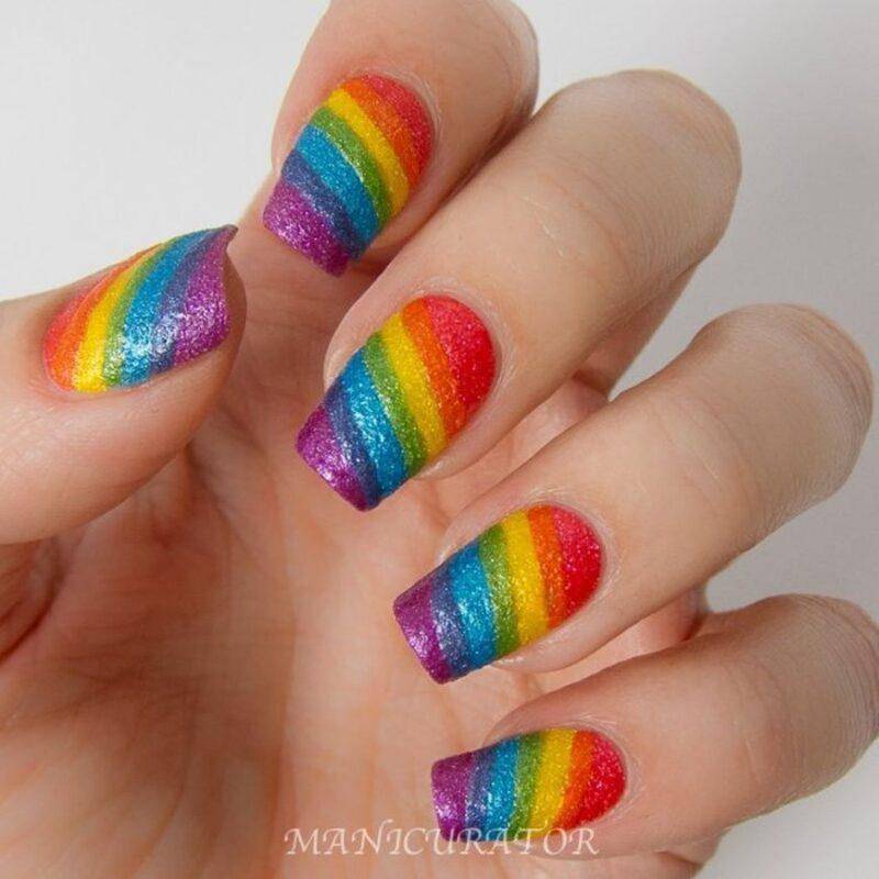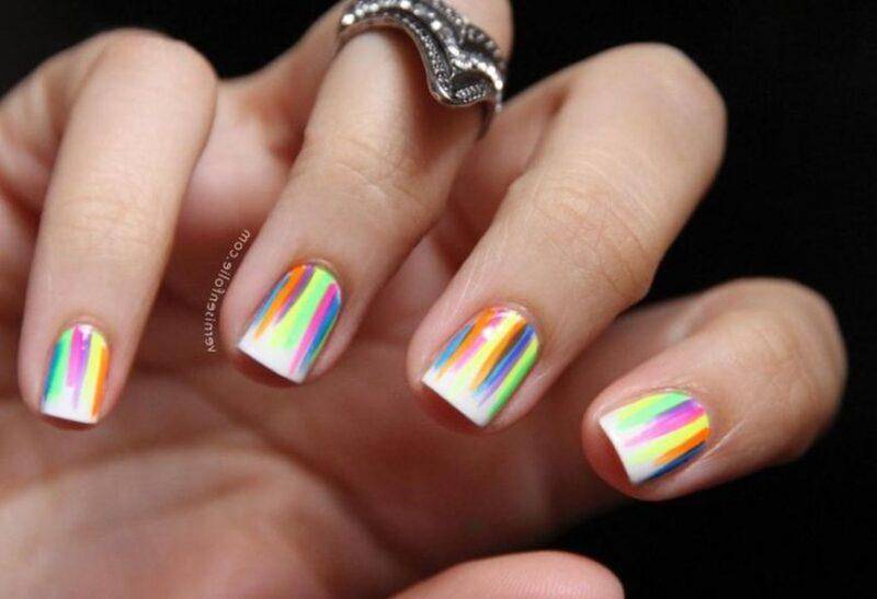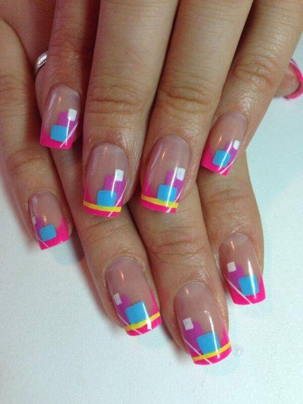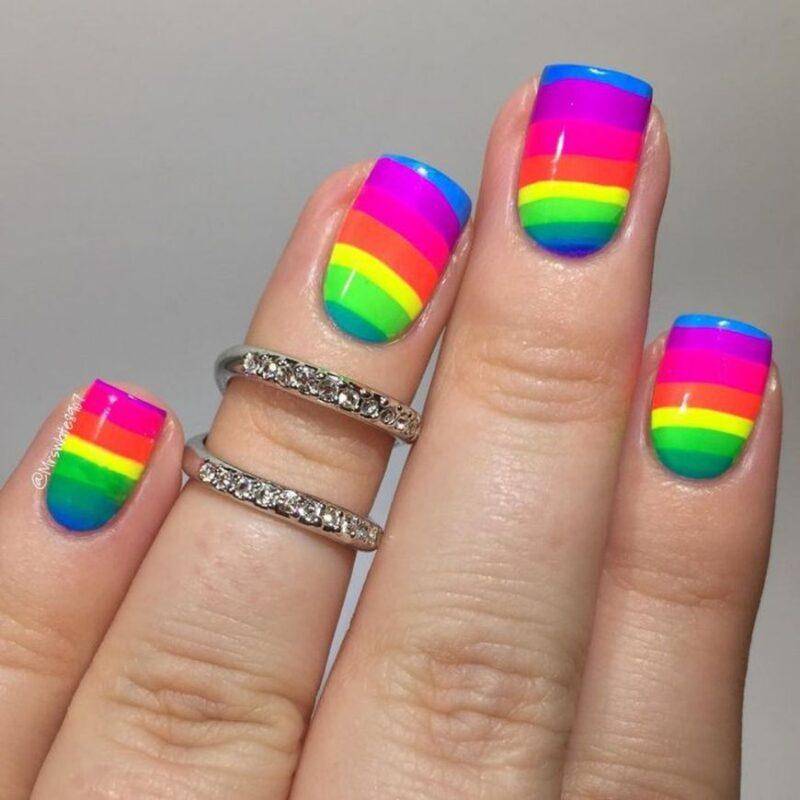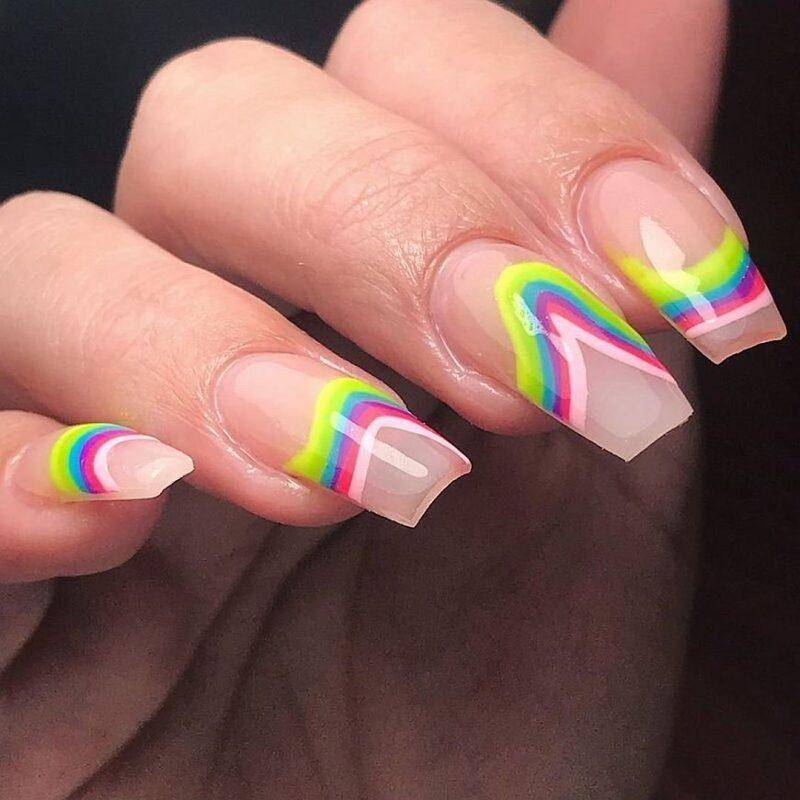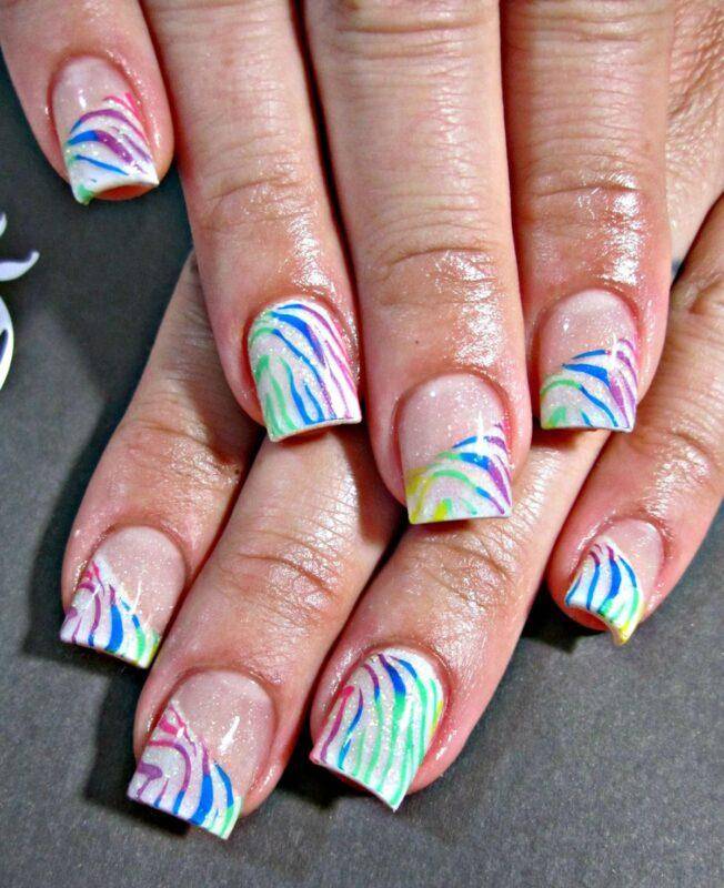 - Изящным и модным решением станет оформление френча тонкими полосками по диагонали с подбором цветовой палитры в виде радуги. А основное ложе прорисовывается геометрическими фигурами. Этот дизайн подойдет для женщин, не боящихся выглядеть ярко и экстравагантно.