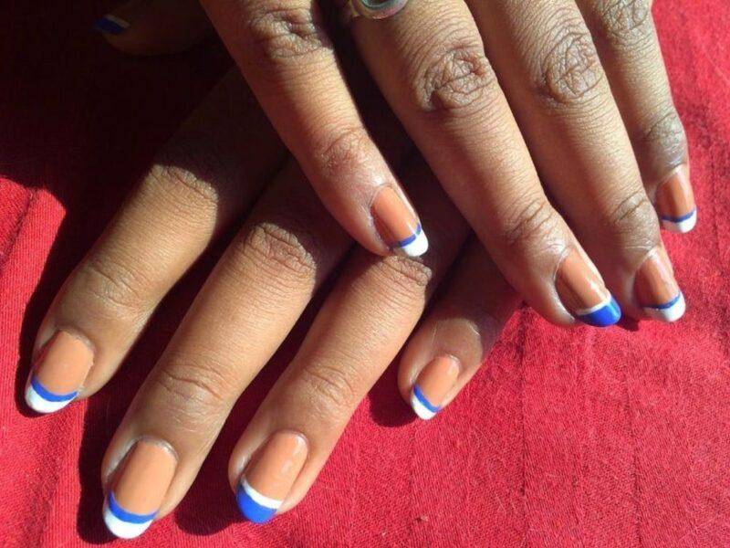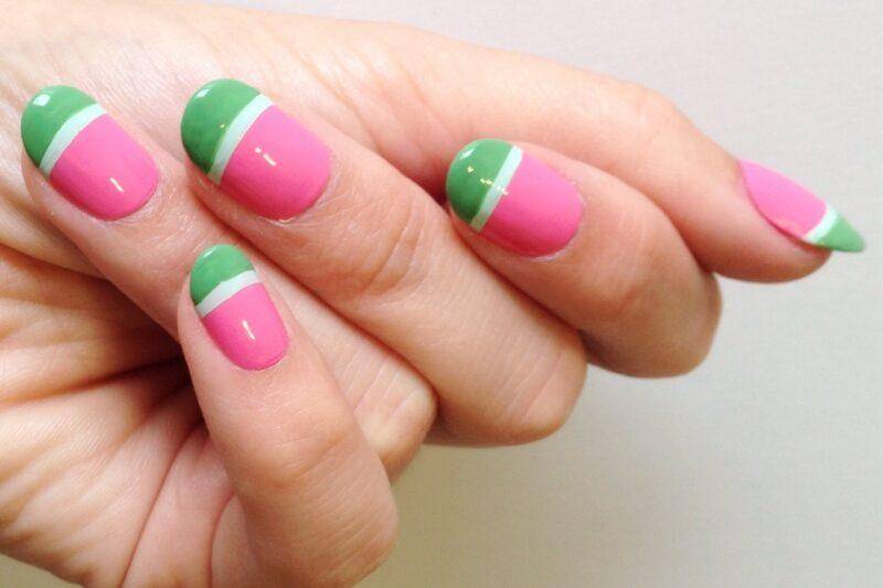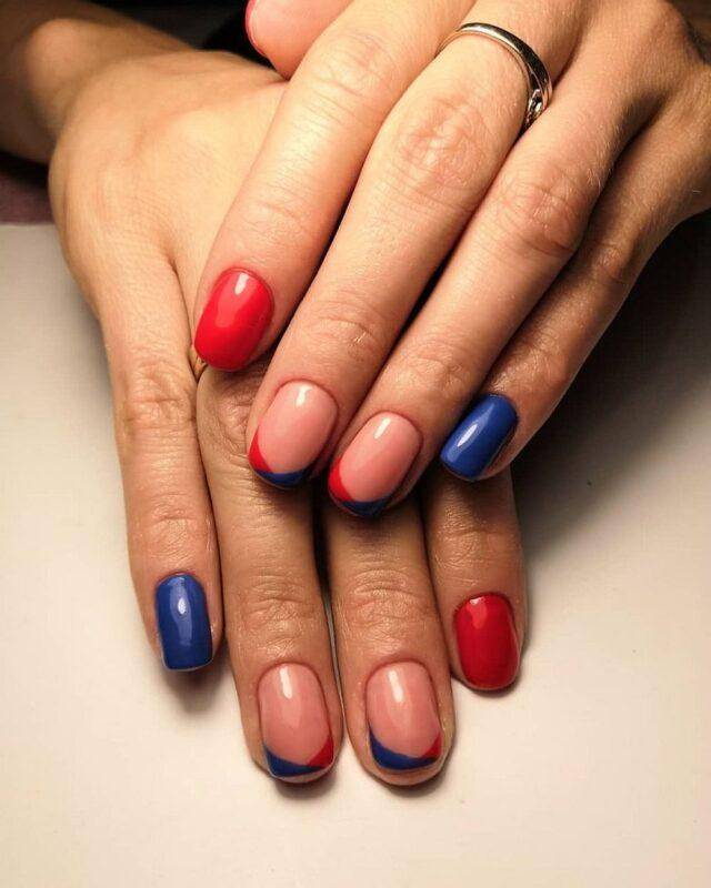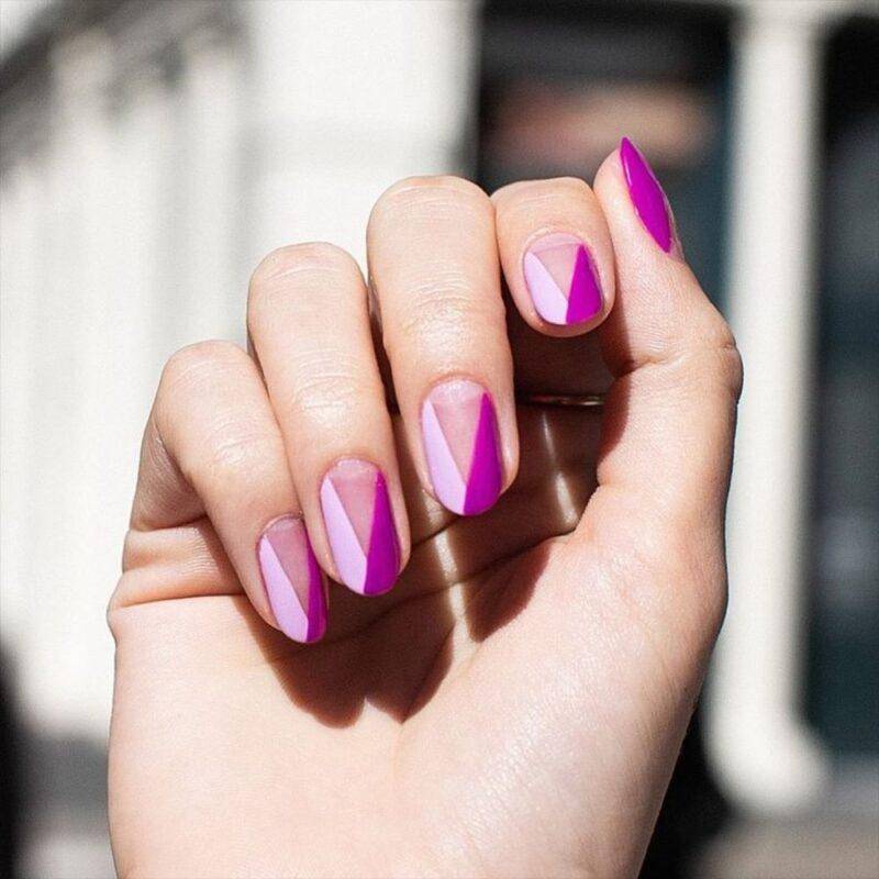 - Френч с треугольным трафаретом. Цветная полоска оформляется в виде двух треугольников разного цвета.