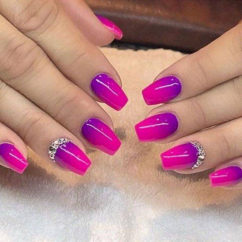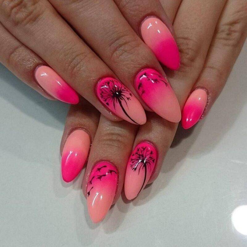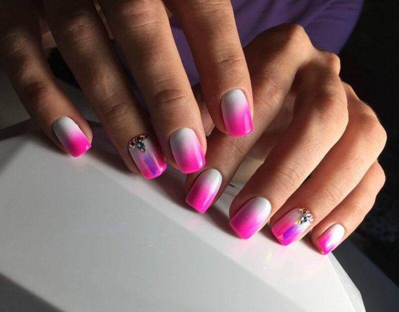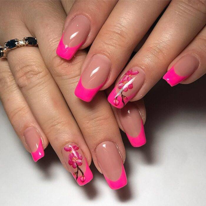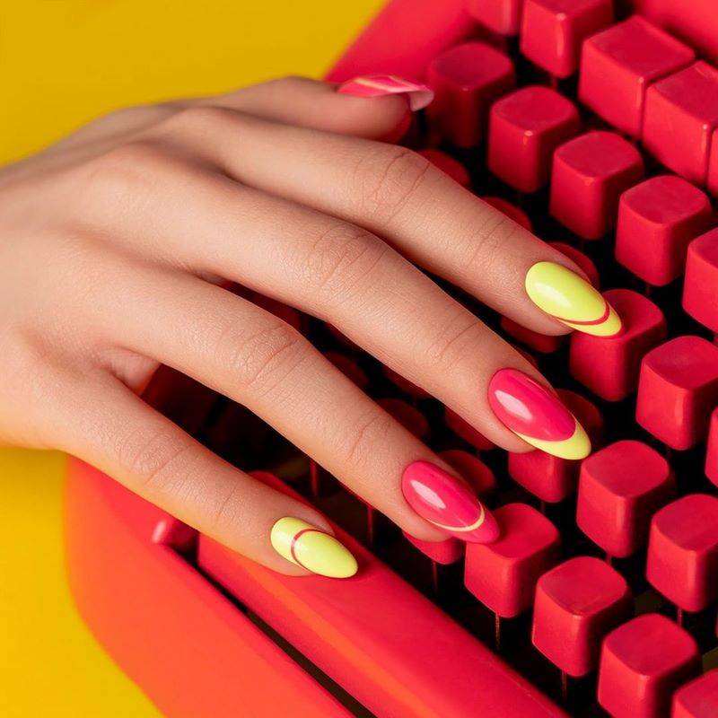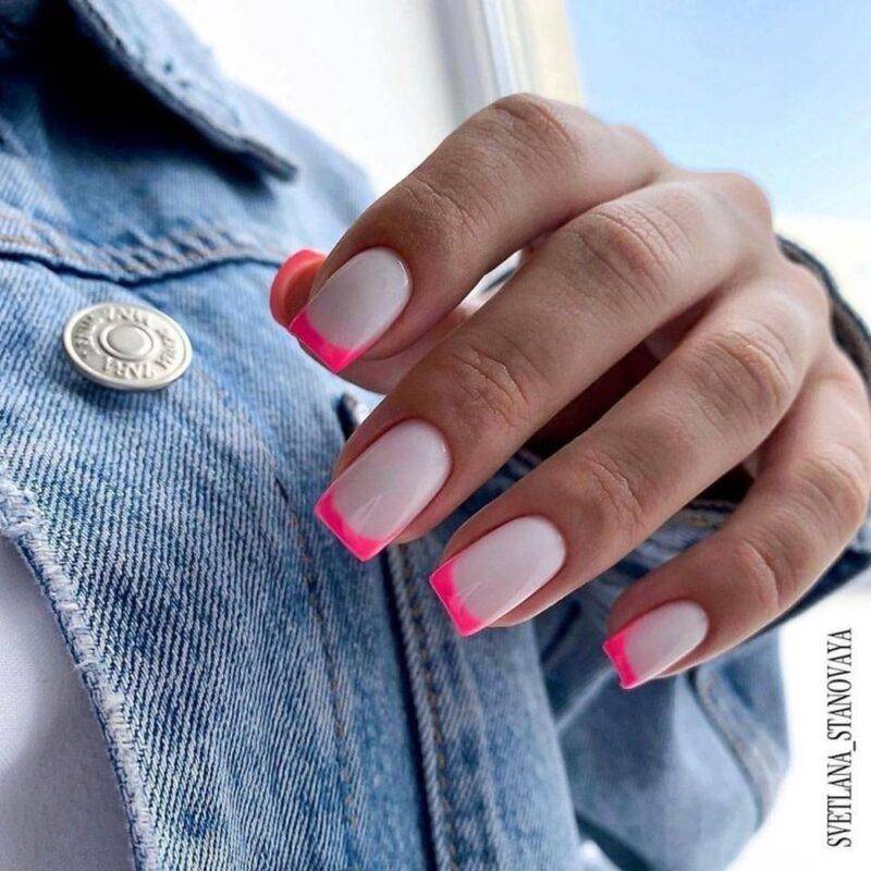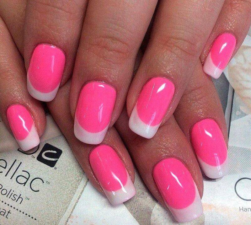 Трендовый ярко-розовый цвет идеально подойдёт для украшения кончиков ногтя в технике цветного французского маникюра. Также можно совместить два розовых оттенка – светлый и тёмный, чтобы нарисовать улыбку и выполнить базовое покрытие.
