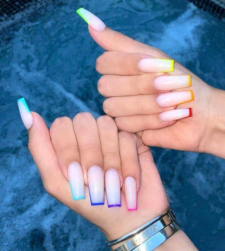 Любой из этих вариантов не оставит без внимания окружающих ноготки с цветным кончиком. Руки с таким маникюром выглядят настолько ухоженными и красивыми, что абсолютно не нуждаются в дополнительных украшениях в виде колец или браслетов.