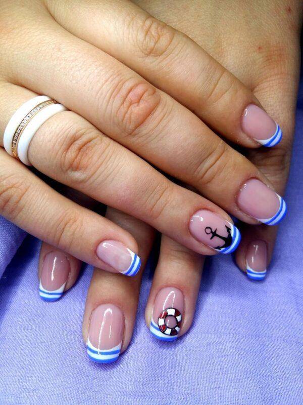 - Маникюр с рисунком. В сочетании с яркими полосками теплых оттенков такой вариант особенно хорош для летних образов, а выполненный в бело-синей гамме подойдет для морозных дней. Рисунок можно нанести при помощи наклеек, а можно нарисовать самостоятельно, разумеется, при наличии определенных навыков.
