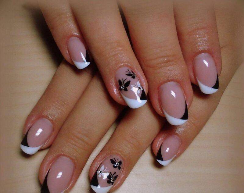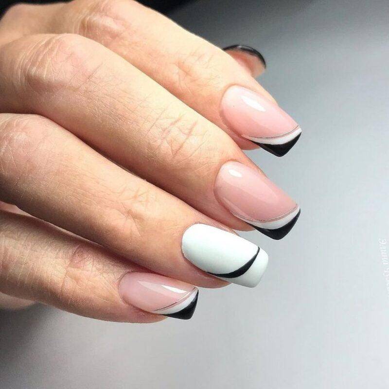 Измените традиционный французский маникюр, используя противоположный цвет на кончиках – черный. Увеличьте естественную кривую ногтя, чтобы получить эффект округления, который вы можете видеть на фото. Вы можете выбрать базовый пастельный цвет или просто прозрачный лак для ногтей.