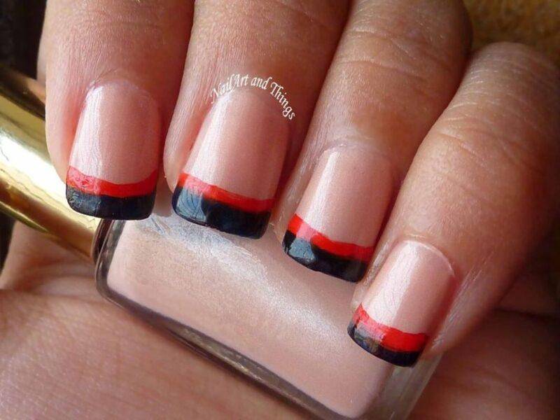 Такой дизайн подходит для разной формы ногтей, к тому же, его можно выполнить весьма необычным, например, с тремя цветовыми полосками, с треугольной улыбкой, с добавлением блестящей линии.