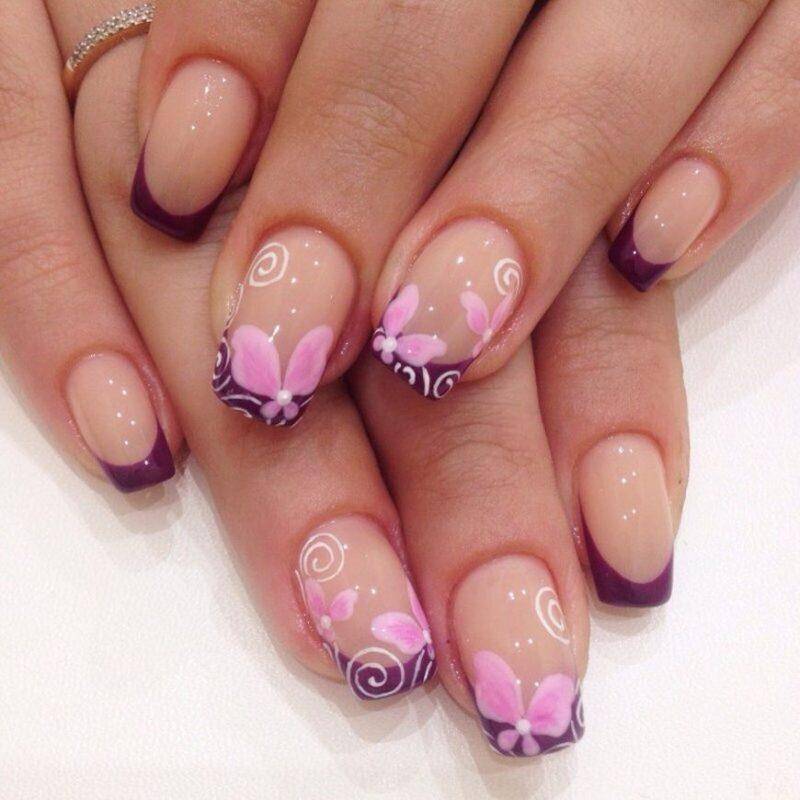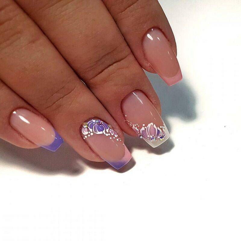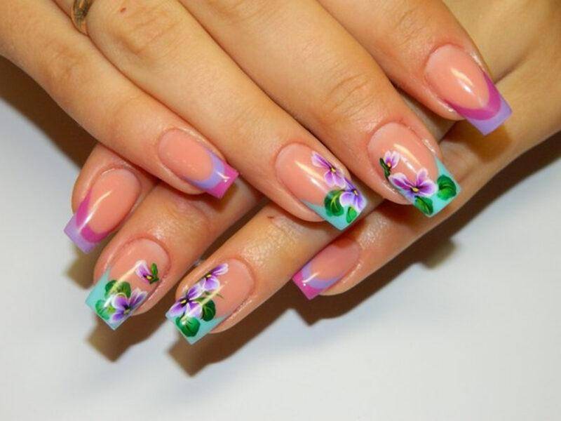 Цветочные узоры всегда радуют глаза дам. Их красотой невозможно не восхищаться. С ними цветной френч выглядит особенно нежно и лаконично. Такое оформление чаще всего выбирают романтичные натуры в весенне-летний период. Здесь актуально будет добавить немного страз или мелких блесток. Получится создать более насыщенный дизайн.