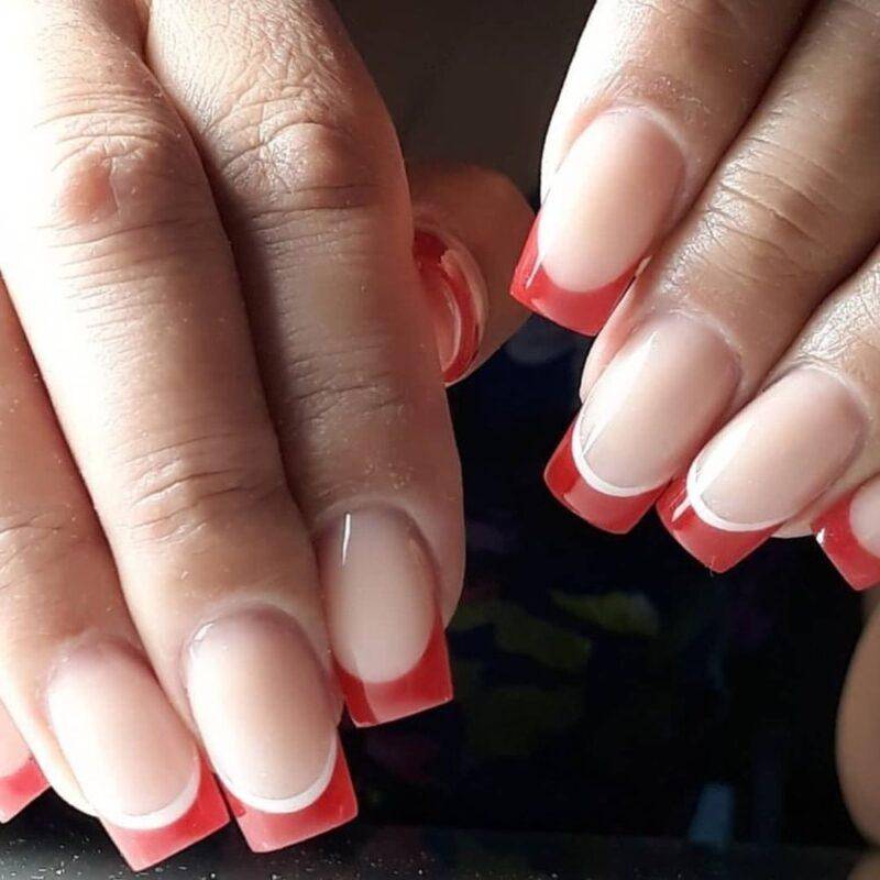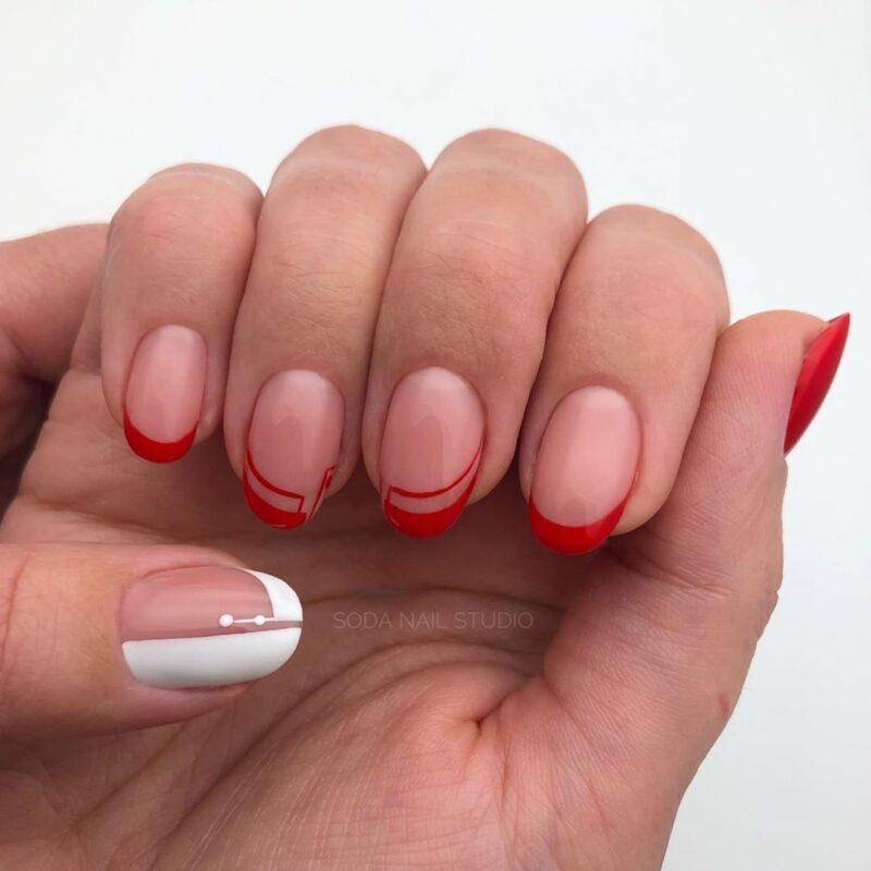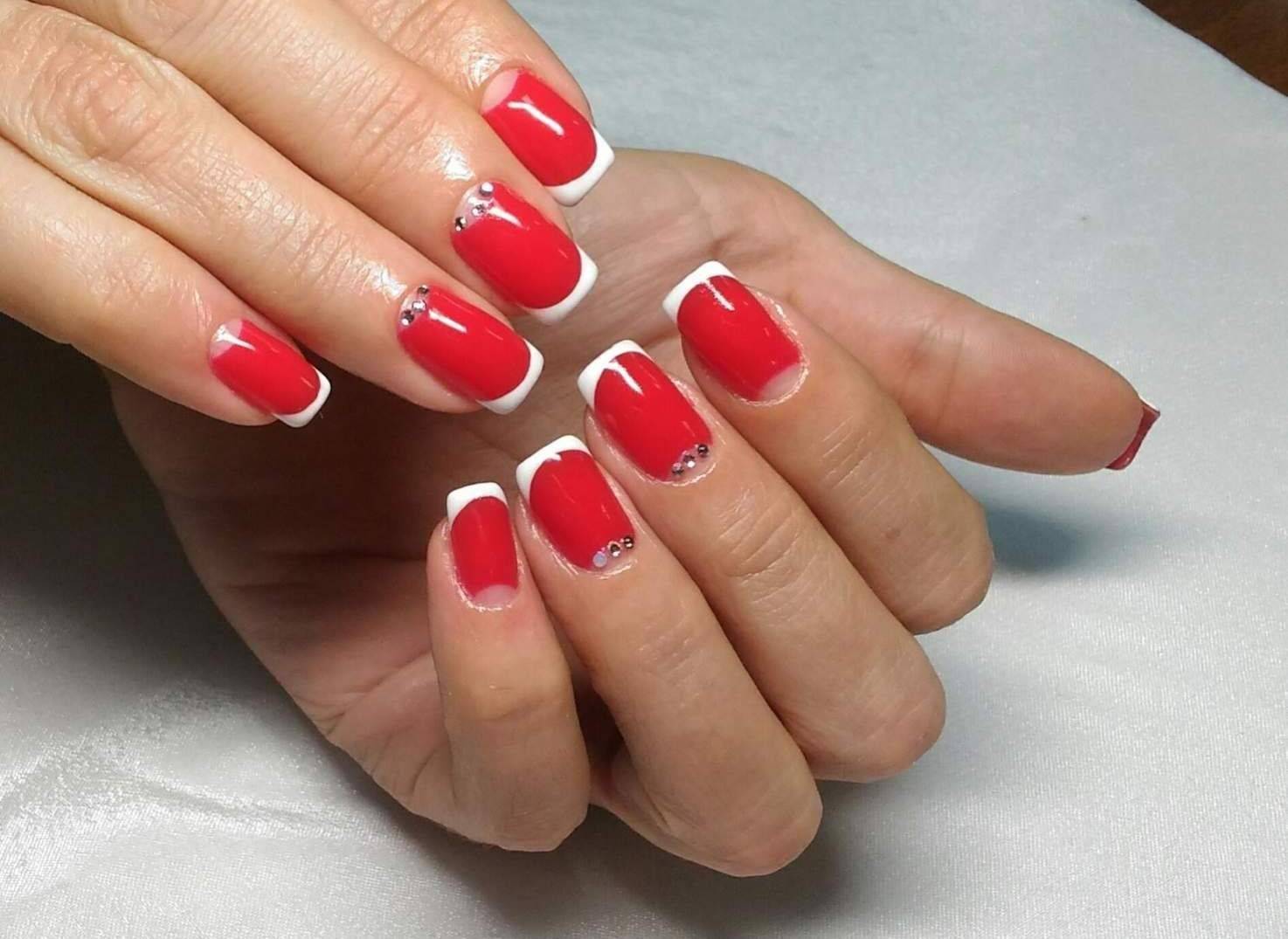 Варианты красно-белого френча с узором на короткие и длинные ногти