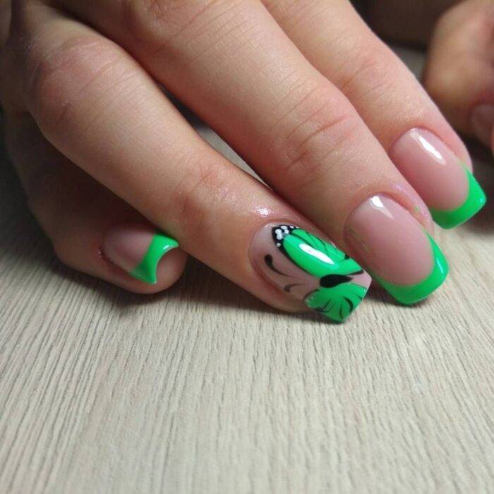 Еще один популярный вариант — иллюстрации с мотыльками. В союзе с цветной «улыбкой» выглядит невероятно эффектно. Бабочки могут быть любой формы и любого размера. Их можно нанести на все ногти или сделать акцент на одном. Такое оформление смотрится легко и нежно.