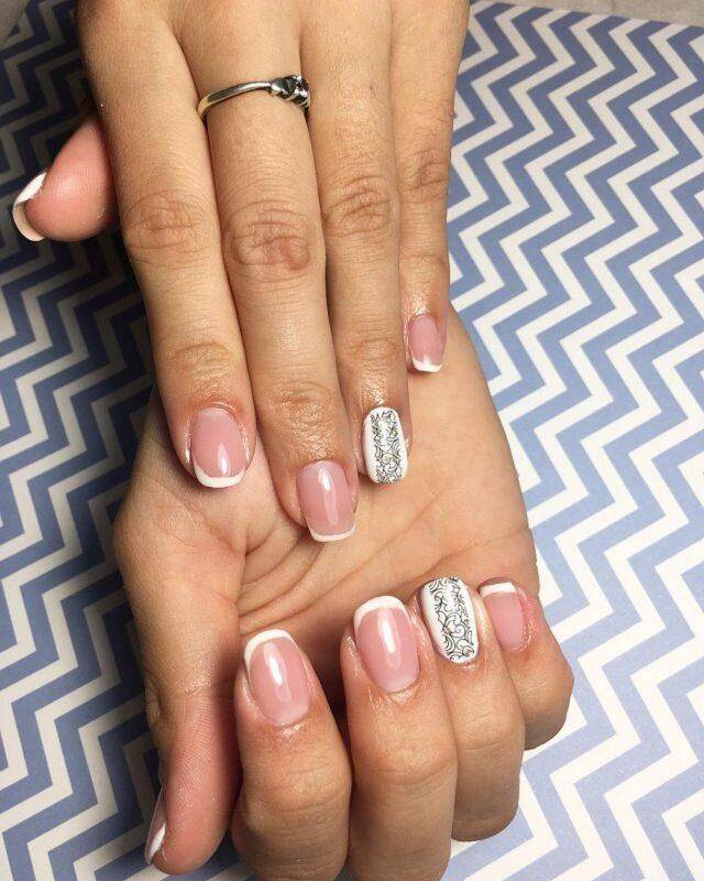 Классика – здесь все предельно просто и понятно. Главное – получить гладкую поверхность нежного пастельного оттенка. На ней прорисовывают белоснежную «улыбку» по краю ногтя. Сверху все обязательно покрывают защитным слоем, который не только предохраняет от появления изъянов, но и добавляет блеска.