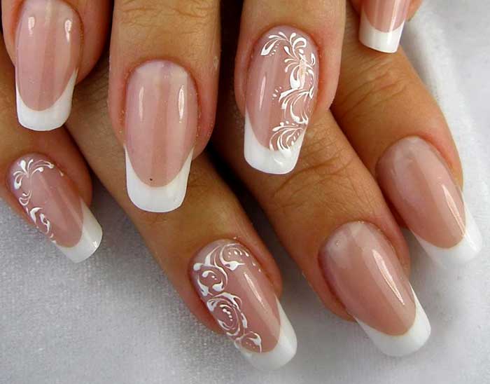 Свадебный вариант французского маникюра – это, как правило, сочетание кружевного маникюра со стразами, жемчугом, блестками и рисунком. Французский маникюр считается классикой жанра. Он не вычурный, а напротив очень элегантный и красивый, именно поэтому его часто делают невесты.