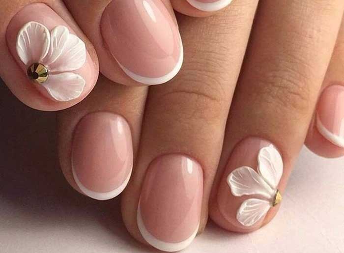 Этот дизайн будет прекрасным выбором для невесты в ее свадебный день. Белый цветок на безыменном пальце – действительно эффективный способ сделать стандартный французский маникюр особенным. Вы можете сами нарисовать цветок очень тонкой кистью, или же пойти по более простому пути и просто приобрести наклейку для ногтя и прикрепить ее на желаемый ноготь.