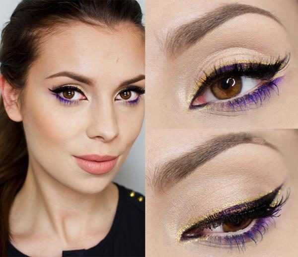 Создание романтического образа достигается путем применения теплых тонов фиолетового. Вечерний макияж карих глаз делает их выразительными с применением электрических оттенков синего. Оттенки золота также придадут кареглазым красавицам большей выразительности во взгляде.