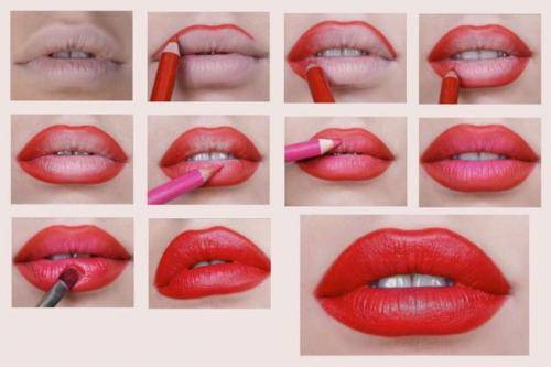 - Схема макияжа губ: сначала карандаш, потом помада и немного блеска. Или без блеска. Если помада нюдовая и едва заметная, можно и без карандаша. В своем арсенале лучше иметь помаду нейтрального цвета и классическую алую для вечера.