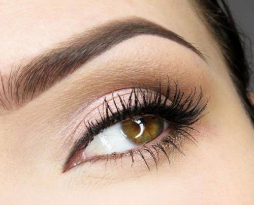 - Для натурального лука: подведите верхние ресницы чёрной подводкой. Таким образом, глаза будут казаться больше, а ресницы — гуще.