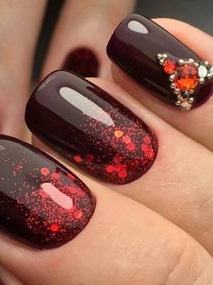 Варианты красного и черного новогоднего маникюра-2021 с блестками: идеи и фото