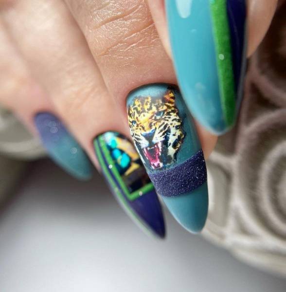 Очень символично будет смотреться красивый маникюр с тигром на Новый год. Поэтому мы принимаем к сведению задумки дизайнеров и спешим удивить обладательницу года креативным подходом к образу Нового года. Выполнение маникюра с тигром включает в себя выполнение различных техник, от использования клея, ползунков до аэрографии и рисования изобразительного искусства.