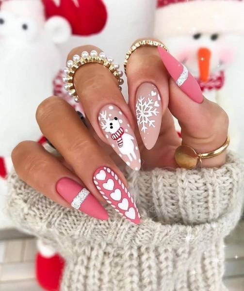 Выше уже говорилось о том, что красный ассоциируется с Дедом Морозом, поэтому можно создать рисунки этого персонажа на ногтях либо полностью сделать ногти блестящими и украсить снежинками.