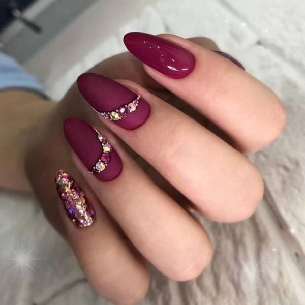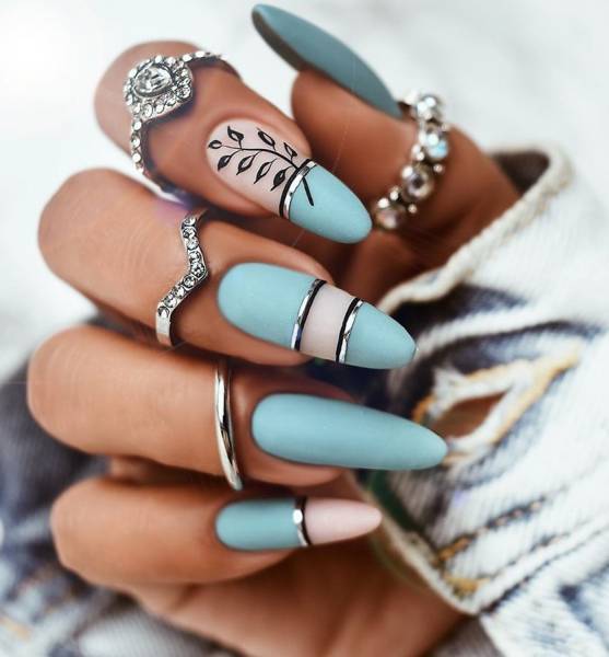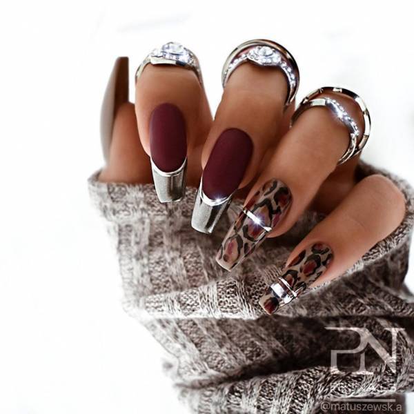 Матовый декор. Одно из достоинств длинного маникюра — отличное сочетание с матовыми и бархатистыми покрытиями. За счет большой длины ногтевые пластины не выглядят слишком маленькими. Матовая текстура хорошо подходит к темным лакам, а также легкими пастельным оттенкам.