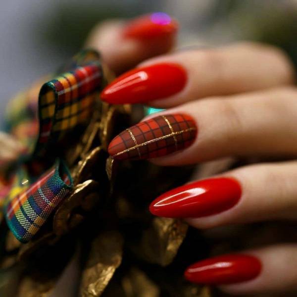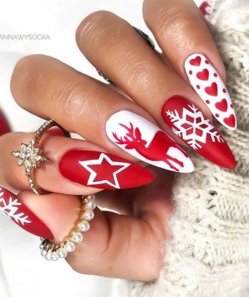 - Эффектный нейл-арт в лучших новогодних традициях почти всегда включает красный цвет. Его активная палитра подразумевает как ярко-алые, так и благородные бордовые оттенки. Беспроигрышное сочетание вы получите с белым и золотым, но приветствуются и другие цветовые эксперименты.