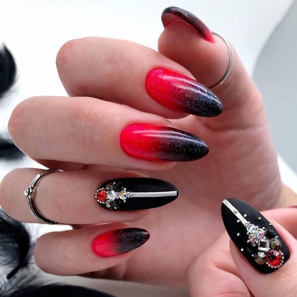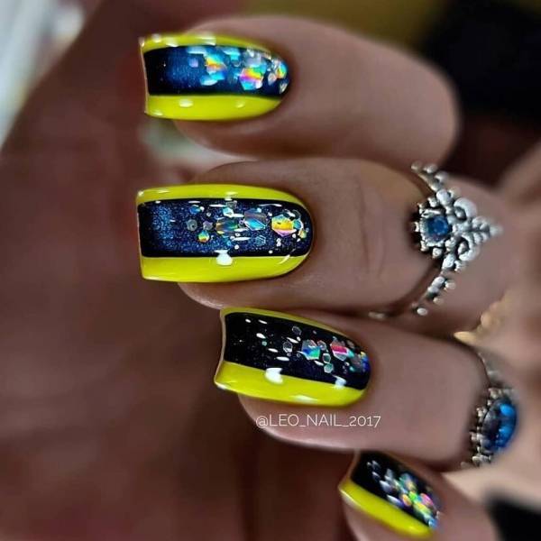 Сочетания темного и яркого. Броские неоновые цвета хорошо оттеняются черным лаком. Для особой торжественности к данному тандему добавляют прозрачные стразы или галографические камифубики.