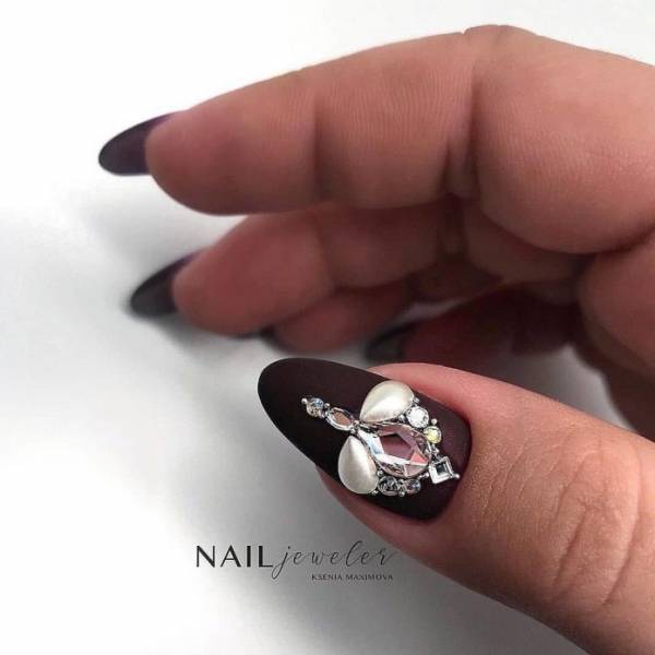 Шоколадный маникюр. Различные оттенки темно-коричневого цвета создают красивый дизайн для удлиненных ногтей. В этом случае уместен как однотонный декор, так и сочетание с небольшим количеством дизайнерского оформления.