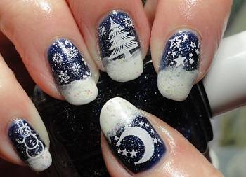 Получаем размытую кляксу на том месте, где ноготь не закрыт скотчем. Наносим такой отпечаток на ноготь несколько раз, пока он не станет дос таточно ярким. И сразу, аккуратно подцепляем скотч за тот край, который лежит на коже пальца и снимаем его с ногтя. В результате получаем такой северно-снежный маникюр как на фото ниже.