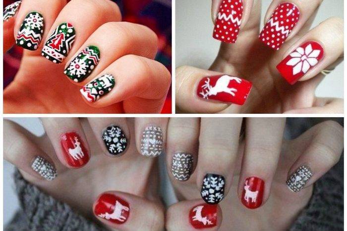 Обратите внимание, что новогодний маникюр на короткие ногти также может быть максимально разнообразным не только по цветам, но и по форме — умелые мастера маникюра сумеют придать и округлую, и овальную, и квадратную форму коротким ноготкам — вот только модный заостренный кончик на них, скорее всего, будет смотреться странно. Но в целом у вас будет огромный выбор!