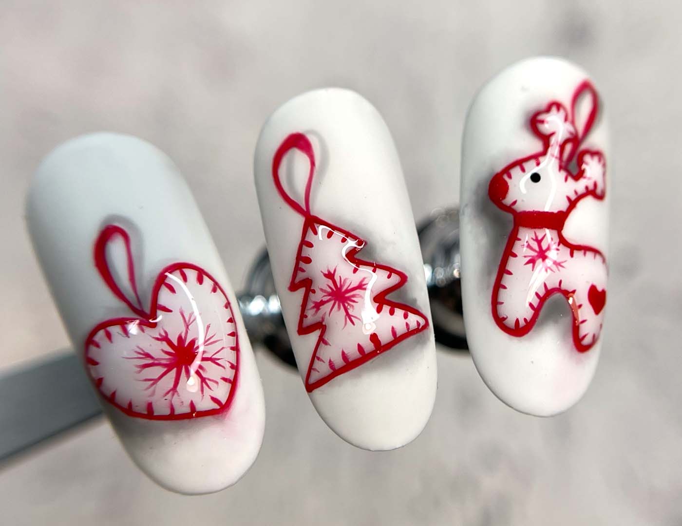 - Рисуем красным гель-лаком (или гель-краской) окантовку фигурки, сушим в лампе.