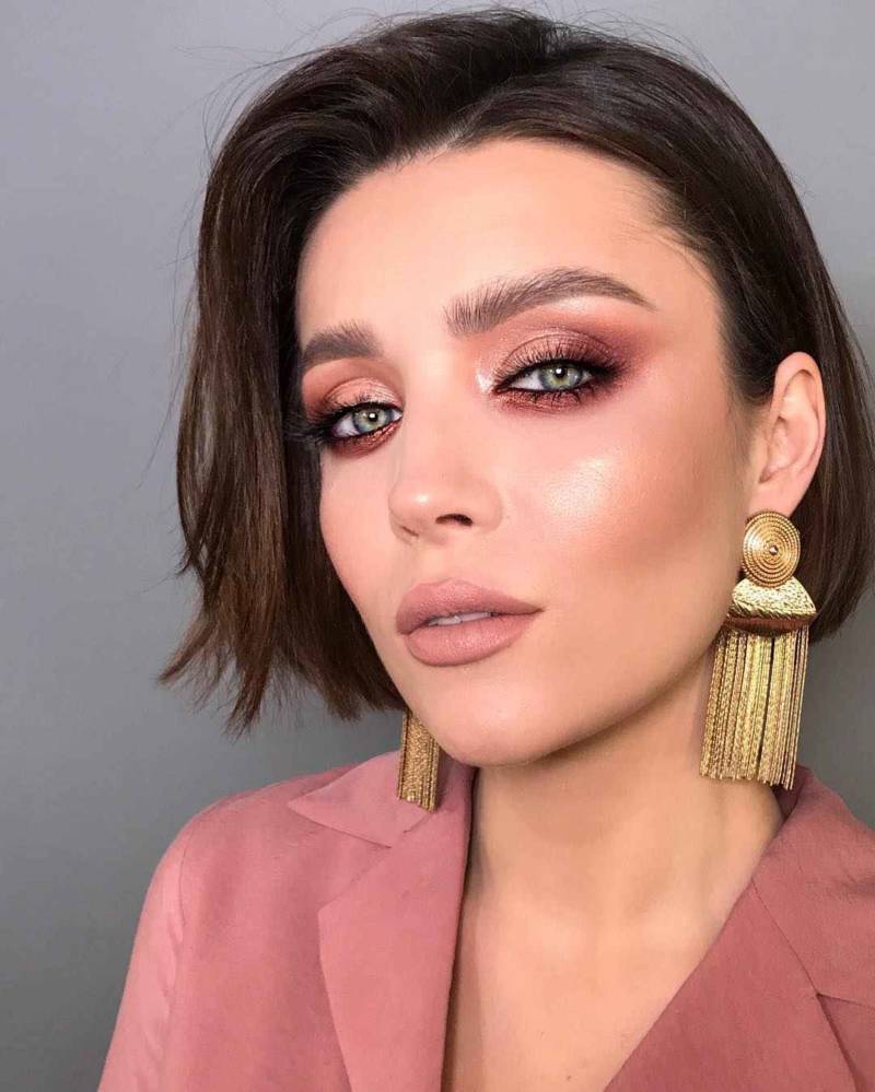 Макияж под конкретное платье или наряд. Конечно, чаще всего девушек интересует макияж под платье белое. Да, свадебный make up — один из самых популярных видов. Не стоит перегружать образ невесты яркими тенями. Чаще всего глаза украшают дымными и розовыми цветами. Чтобы сделать образ более благородным, используют матовые оттенки. Очень мягкие стрелки, нарисованные при помощи темных теней также внесут романтики в образ, а пышный ряд накладных ресниц добавит картинке кукольности, невинности и свежести.