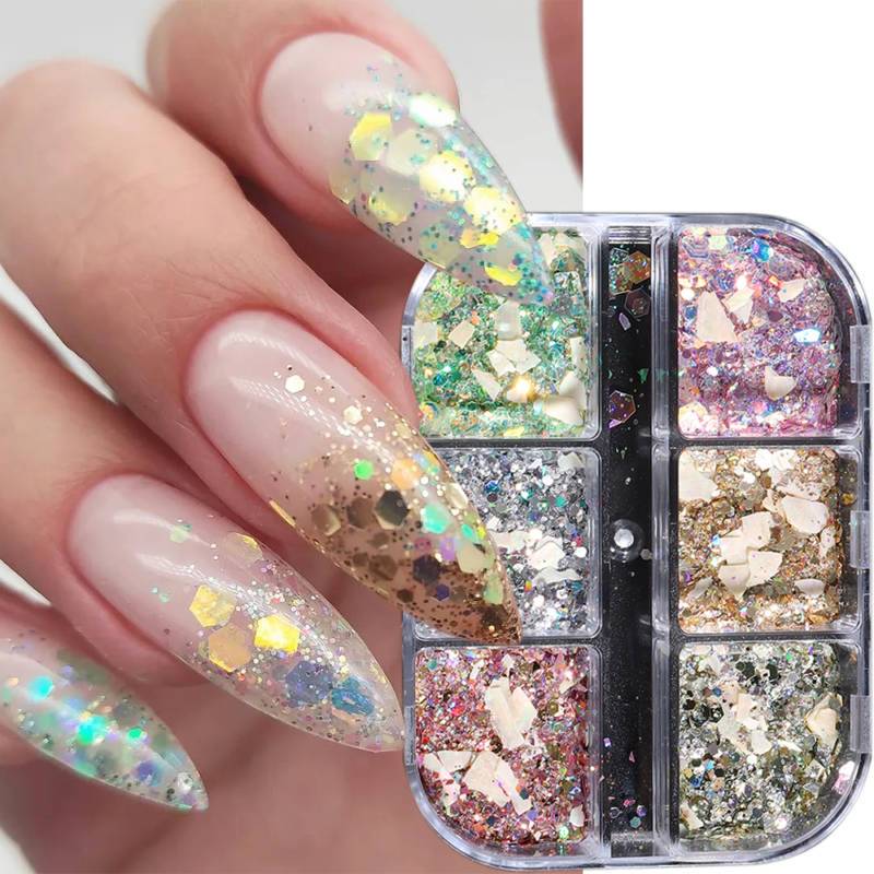 Для того, чтобы нашим читателям было легче просматривать и представлять себе описанные вариации маникюра, мы предлагаем сначала немного познакомиться с видами блесток, которые являются отличными аналогами для множества украшений, таких как стразы, жемчуг, бульонки или бусы. Однако мы сразу заметили, что добавление одного варианта декора к другому совсем не противоречит модным тенденциям. Маленькие глиттеры — мерцание, которое всегда выглядит привлекательно, может наноситься как часть прозрачного покрытия или как пудра. Крупные блестки включают в себя различные конфетти и блестки, которые также можно раскрошить или добавить к прозрачному покрытию. Камифубуки — это ромбы, круги и различные фигуры из фольги и полимера. Кстати, фольгу можно использовать в маникюре как отдельное украшение, а блестки обычно бывают разных цветов и форм. Большой популярностью также пользуются разнообразные пайетки, цветы втирки и другие материалы.