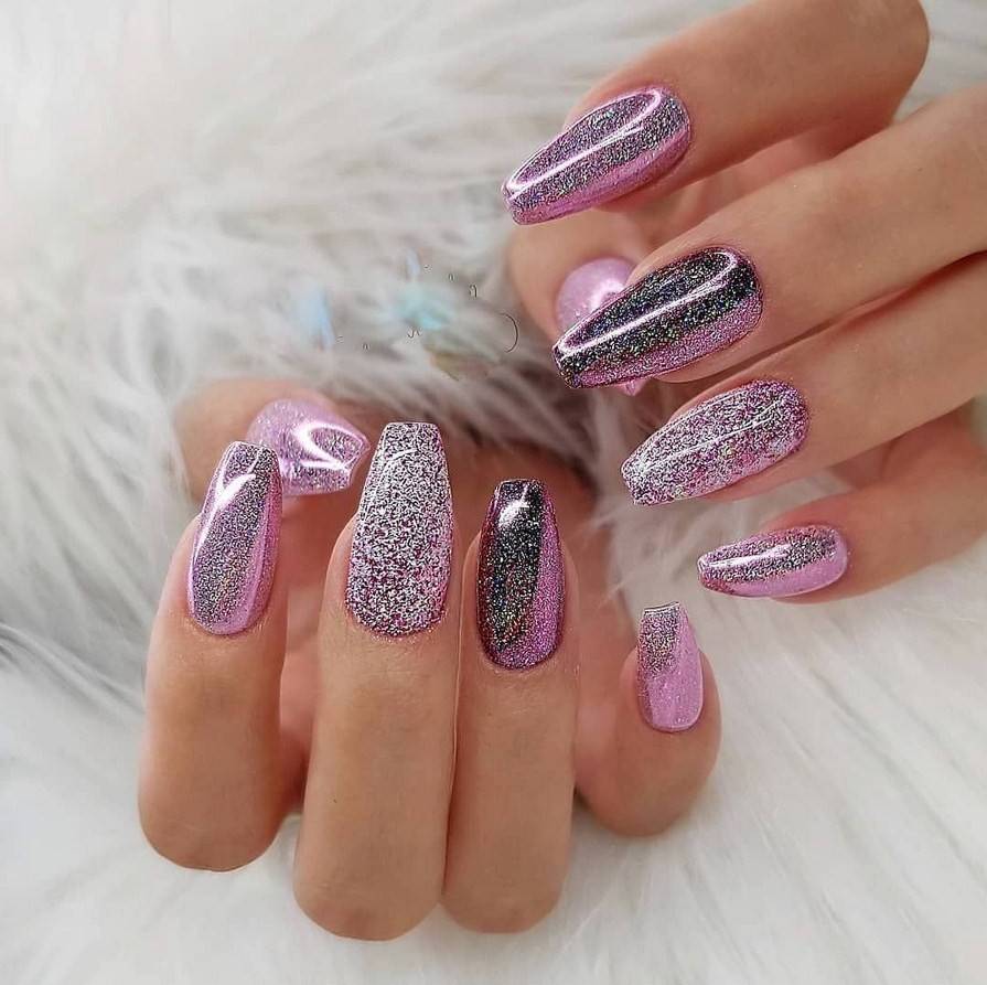 Для градиента, в данном случае, используются голографические розовые конфетти, серебристые блестки и голографическая пыль. Смоделированные ногти необходимо хорошо обезжирить, а покрытие гель-лаком не обязательно.