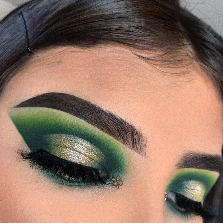 В её мейкапе нет ничего лишнего. Более яркий пигмент зелёного она подчеркивает шиммерными тенями, лёгкой аккуратной стрелкой, а также бронзовой подводкой на слизистой оболочке нижнего века.