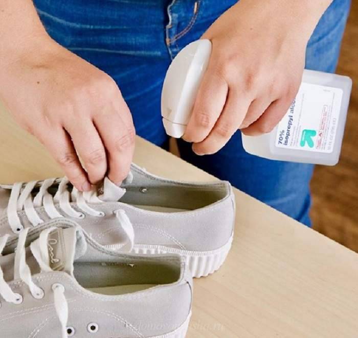 Перекись водорода уничтожает грибок, помогает избавиться от неприятного запаха. Обработка в этом случае выполняется так же, как при использовании спирта и эссенции уксуса. При желании перекись можно заливать внутрь кроссовок, сапог, ботинок и туфель.