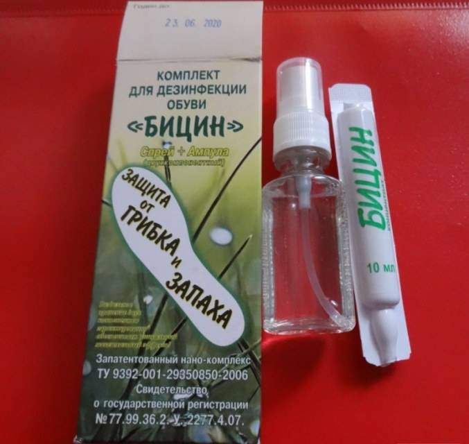 Дезинфицирующий раствор Бицин эффективно убивает грибковую инфекцию. Кроме того, вещество применяется от запаха ног. Жидкость действует до 30–40 дней с момента проведения манипуляции над ботинками.