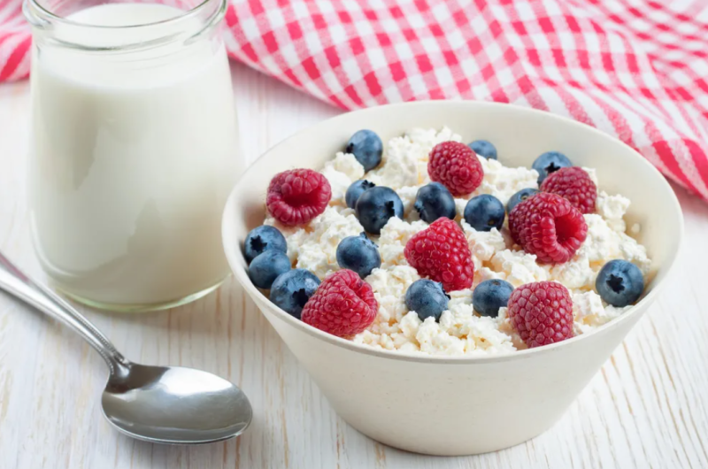 - Второй завтрак: порция творога с ягодами или медом
