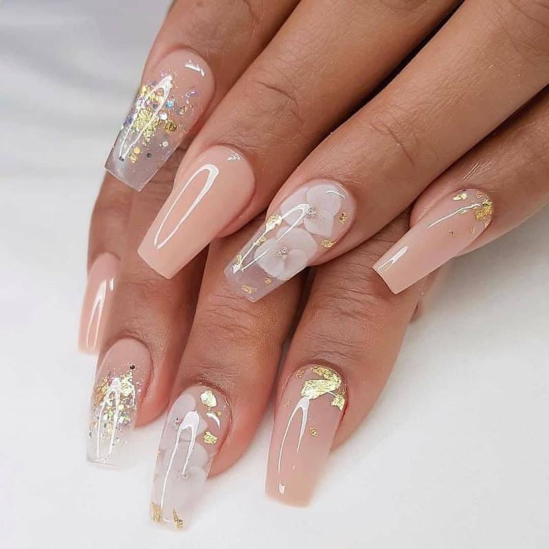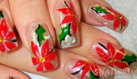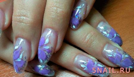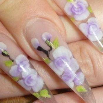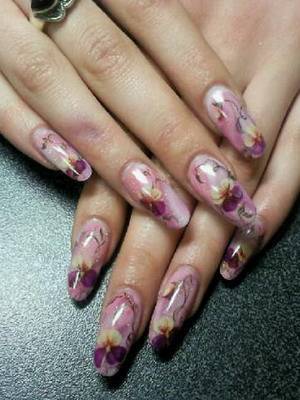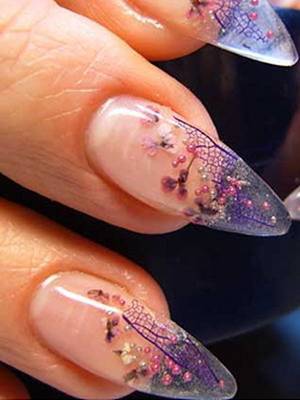 Подобный маникюр выгодно подчеркнет длинные ногти, однако он противопоказан коротким ноготкам. Ни с чем несравнимая естественность, хрупкость и нежность засушенных натуральных цветов придаст вам неповторимую очаровательность. Цветы необходимо тщательно выбирать по размеру, чтобы не исказить и не испортить узор. Дизайнеры рекомендуют использовать аквариумный дизайн в сочетании с французским или лунным маникюром.