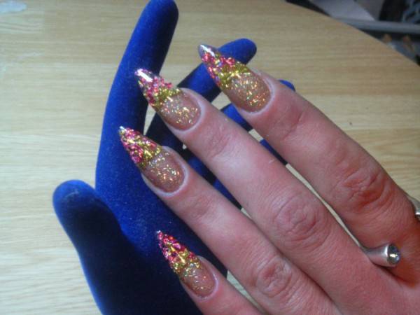 Затем наносим первый, тонкий, слой геля. На него же, пока он не застыл, достаточно быстро выкладываем украшения. На первый раз рекомендую ограничиться блеском – он проще всего в работе, чем, например, та же слюда. По мере роста мастерства вы уже сможете сочетать украшения и усложнять дизайн. Теперь отправляем ногти сушиться на 2 минуты. Сверху наносим второй, также не толстый, слой геля. Этот слой должен выровнять поверхность: украшения не должны торчать сквозь гель, ноготь должен быть идеально гладким. Посмотрите на свои ногти сбоку: справились ли вы с этой задачей? Если да, то снова сушим 2 минуты. Снимаем липкий слой геля жидкостью для снятия лака, покрываем сверху бесцветным лаком. Увлажняем кутикулу кремом для рук или маслом