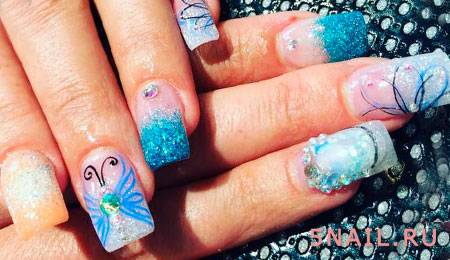 Можно ли делать дизайн ногтей аквариум на короткие ногти? В принципе, да. Хотя он выглядит потрясающе на длинных ногтях, где можно себе позволить буйство воображения, использовав массу интересного декора, можно сделать такой нейл арт на короткие ногти. Правда, на совсем короткие лучше все-таки не делать, так как ноготь может казаться широким и неэстетичным. Лучше все-таки обратиться к мастеру и немного нарастить ногтевую пластину, чтобы ногти выглядели более изящно.