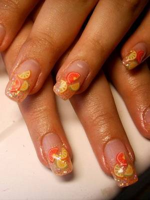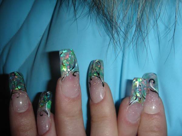 Как мы уже упоминали, длина ногтя в данном случае не важна, поэтому даже на коротких наращенных ногтях можно выложить оригинальные рисунки: объемные изображения рыбок, водорослей, камушков, замков, кораблей, цветов, ракушек, птиц и зверей, украшенные стразами, блестками, песком, кружевом. Покрытые аквариумным стеклом, акрилом или гелем, их просто невозможно повредить, в отличие от объемного дизайна.