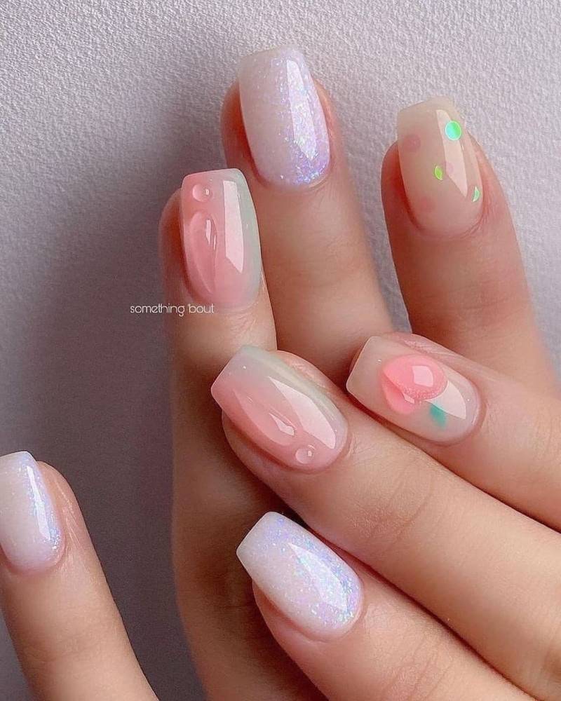 Включайте вашу фантазию и творите волшебство с помощью мерцающих блесток! Вы можете использовать крупные блестки (они наносятся на ноготь дотсом) или мелкие (используйте для его нанесения кисть), а также обсыпать разными блестками каждый ноготок