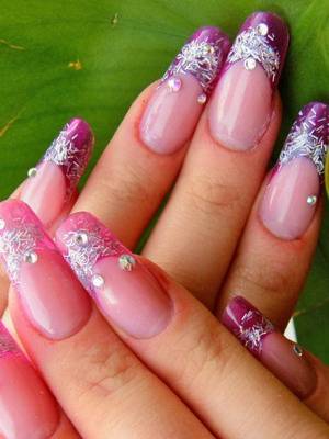 - Теперь нам понадобится трафарет, применяемый для создания французского маникюра. Свободный край оформляют блестящим и переливающимся лаком.